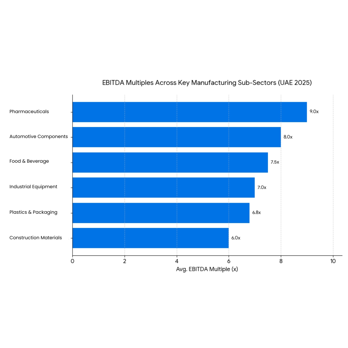 High-margin, export-ready, or government-supported manufacturers, particularly in pharmaceuticals and automotive components, are achieving premium valuation multiples, driven by strong demand, regulatory incentives, and sustainable industrial policies. According to PwC’s Middle East Industrial Manufacturing Insights (2024) and the World Bank’s UAE Economic Update (2025), these sub-sectors have consistently outperformed traditional industries in profitability and capital efficiency.